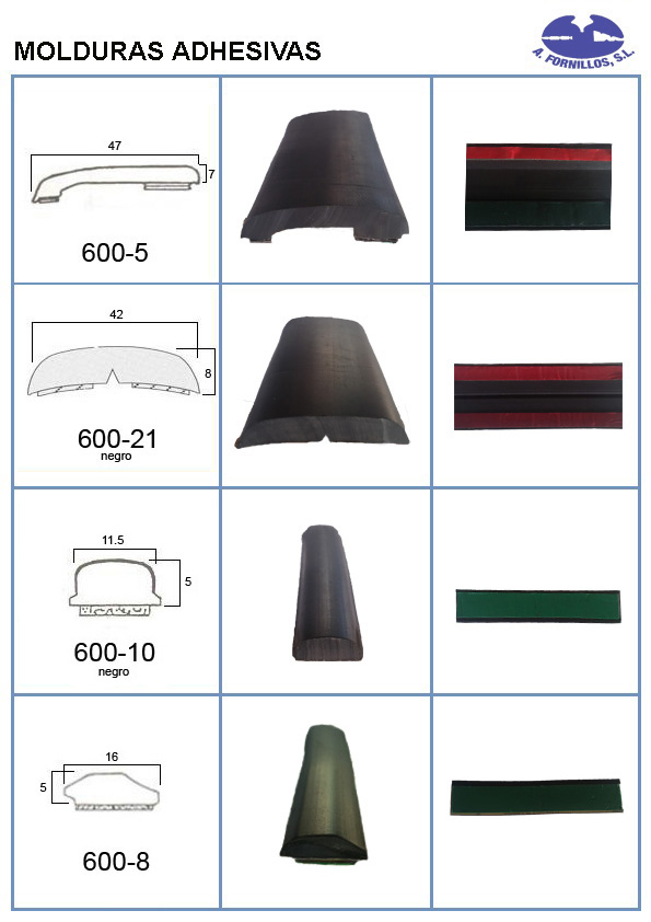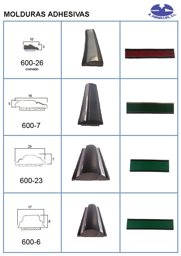 Disponemos del mas amplio catalogo de perfiles de goma, juntas de parabrisas, luneta, puerta, maletero, guía de acristalamiento, cejillas, molduras de aluminio y latón, manecillas, basculas etc.