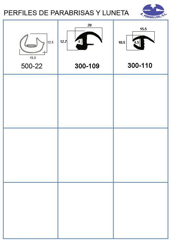 Disponemos del mas amplio catalogo de perfiles de goma, juntas de parabrisas, luneta, puerta, maletero, guía de acristalamiento, cejillas, molduras de aluminio y latón, manecillas, basculas etc.