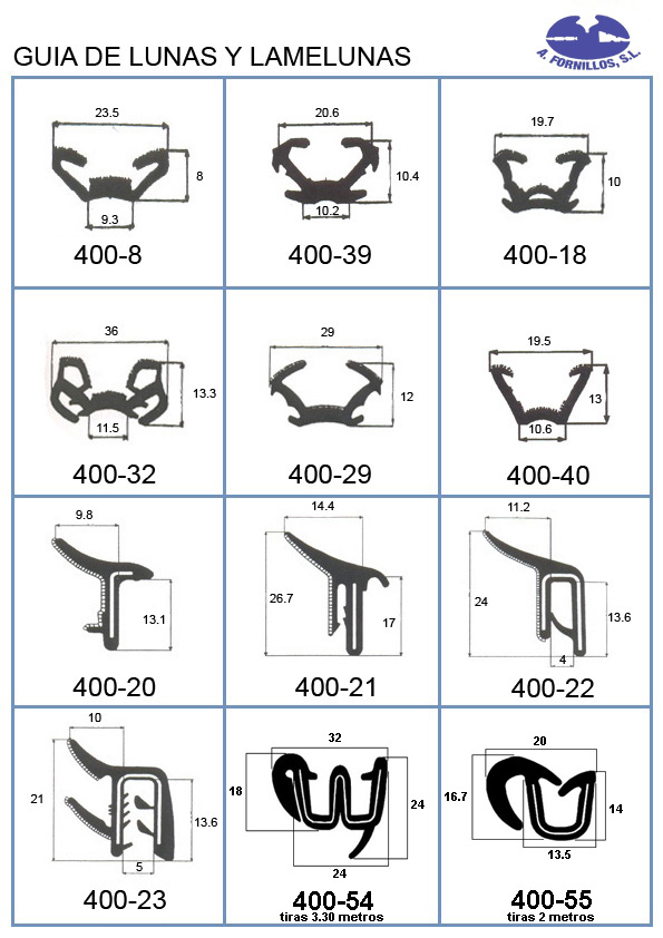 Disponemos del mas amplio catalogo de perfiles de goma, juntas de parabrisas, luneta, puerta, maletero, guía de acristalamiento, cejillas, molduras de aluminio y latón, manecillas, basculas etc.